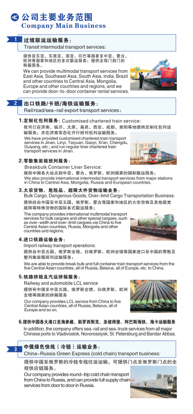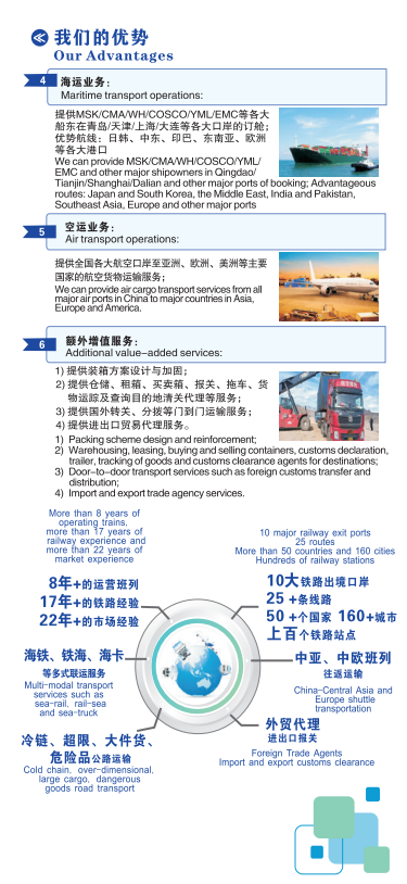 公司总部位于青岛,目前在济南设有分公司,在莫斯科、阿拉木图、塔什干设有办事处,公司可提供定制化集装箱班列运输、和整车国际铁路运输,日、韩、东南亚过境运输,大件货物铁路运输,拼箱货物运输、内贸铁路运输、公路运输、海运运输、空运运输等服务项目,可为客户提供全球各大机场、港口的全、程式物流服务,服务内容包括上门提货、订舱、报关、仓储和配送等。结合完善的全球网络,为客户提供专业化定制化、高效率的全程物流服务,并与全国各铁路局、班列公司、国外代理保持密切联系,及时解决货物在运输中出现的各种问题。
