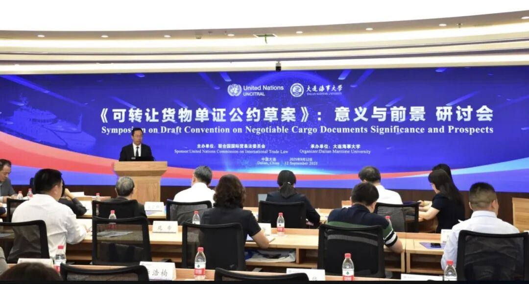 2025年9月12日,由联合国国际贸易法委员会(UNCITRAL)主办、大连海事大学承办的“《可转让货物单证公约草案》:意义与前景研讨会”在大连成功召开。商务部条法司二级巡视员田涯、联合国贸法会秘书长安娜·乔宾·布莱特以及大连海事大学校长单红军等嘉宾出席会议并致辞。来自最高人民法院、国际商会、中国国际货运代理协会、多家学术机构及企业界的专家代表齐聚一堂,参与研讨。