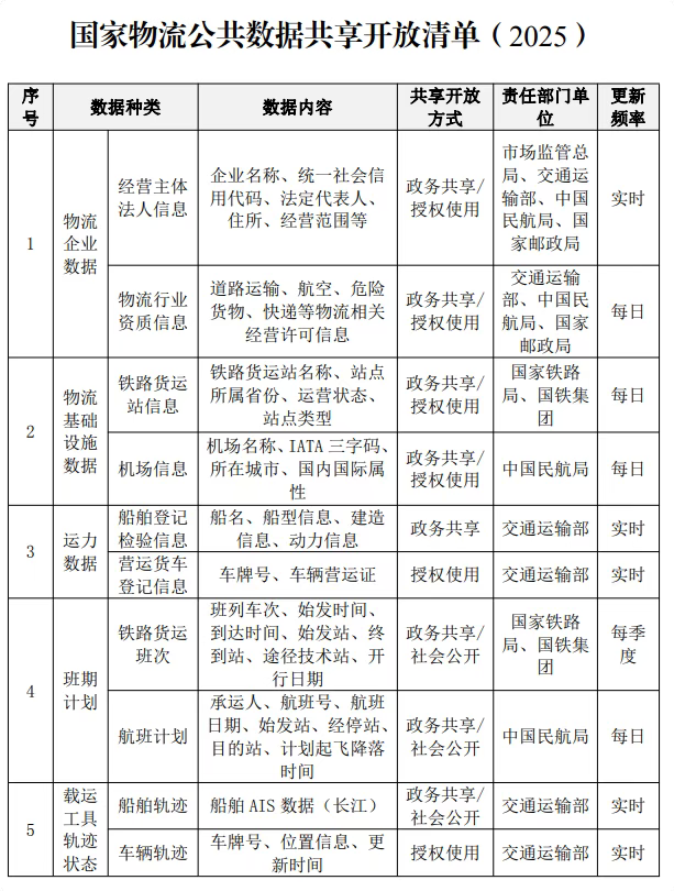 近日,国家发展改革委等部门公布了《关于推动物流数据开放互联 有效降低全社会物流成本的实施方案》(简称《方案》)的印发通知。《方案》提出,要进一步夯实物流数据开放互联基础,推动物流数据开放互联,促进企业物流数据市场化流通利用,加强统筹协调和强化激励引导,建立健全物流数据开放互联安全防护体系。持续推进多式联运相关单证认证、鉴真等技术应用,实现单证可信流转、货物全程追溯,促进多式联运“一单制”“一箱制”加速落地。支持铁路、公路、水路以及第三方物流等骨干企业,向多式联运信息集成服务商转型。同时,《方案》还明确提供了一份国家物流公共数据共享开放清单(2025)。