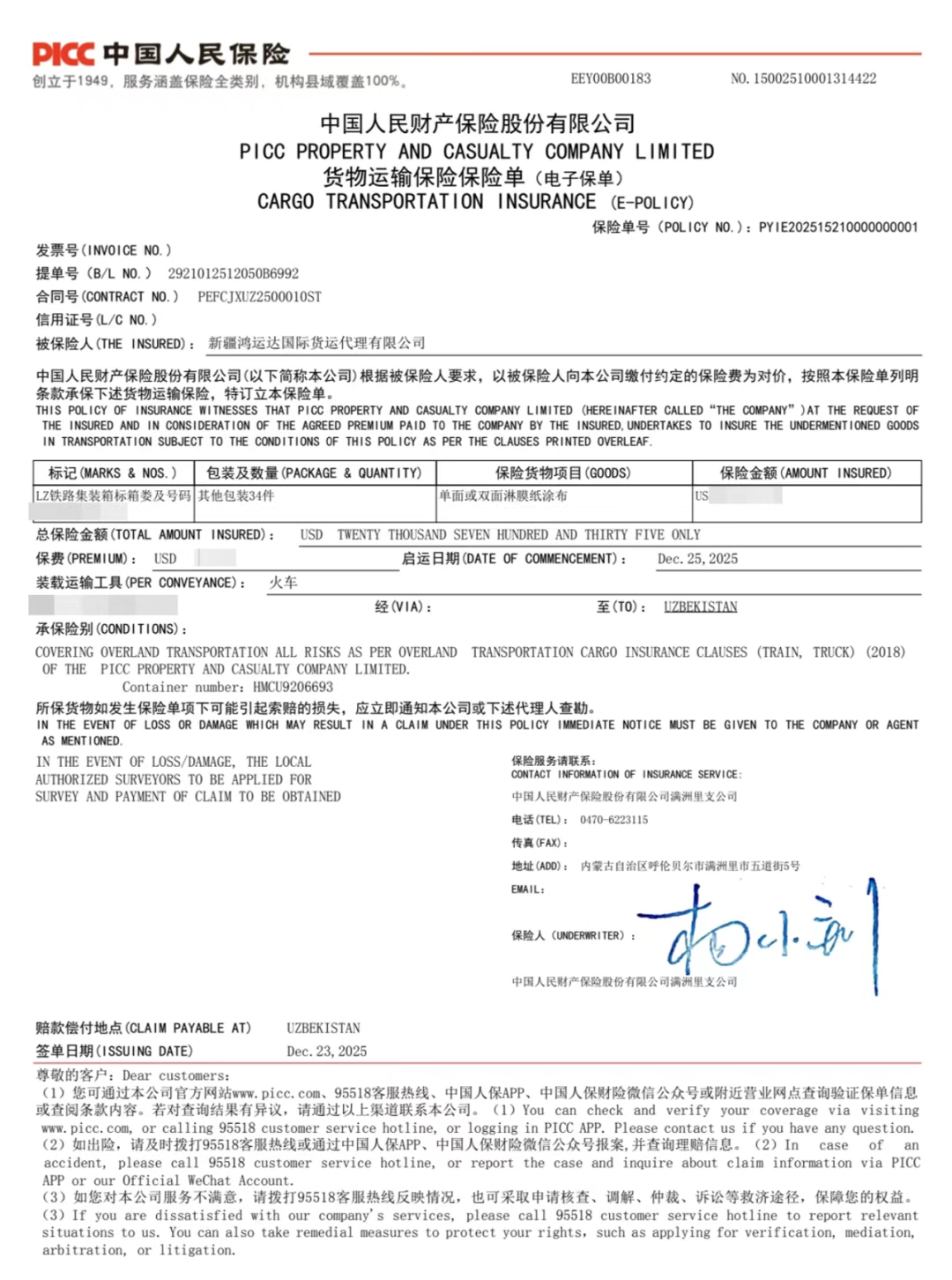 “近日,上运通提单供应链服务平台正式实现了联合国《可转让货物单证公约》通过后的首个重要落地金融保险成果。近日,联合国大会第80届会议审议通过《联合国可转让货物单证公约》,标志着全球多式联运单证规则实现重要突破。在该公约即将于2026年6月将有10个国家签字正式生效的背景下,中国推动的CIFA多式联运提单快速进入实体应用阶段,展现了从国际规则建立到本土化实践的高效转化。作为联合国大会通过的《可转让货物单证公约》的首个重要落地金融保险成果,12月24日中国人民财产保险股份有限公司满洲里支公司为上运通提单供应链服务平台签发了首单提单保险。据了解,本次保险业务由满洲里沐鸿能源有限公司作为投保人,新疆鸿运达国际货运代理有限公司作为被保险人,全面覆盖提单签发、流转、融资及货权交割过程中的各类风险,包括物权争议、责任纠纷等传统跨境货运中的核心风险环节。该保险产品通过标准化条款明确保障范围与理赔机制,有效解决了货代企业在单证流转过程中面临的权责不清问题。作为上运通提单供应链服务平台综合服务体系的关键组成部分,首单保险的落地不仅为货运企业构建了从风险防控到损失补偿的完整保障链条,也标志着"保险+供应链"创新模式在跨境多式联运场景中实现实质性突破。上运通提单供应链服务平台以"一次委托、一单到底、全程负责"为核心理念,依托区块链、大数据等前沿技术,实现了电子提单签发、流转、融资与全程可视化追踪的全流程数字化管理。平台构建起连接货主、货代、班列公司、金融机构与保险机构的多方协同生态,系统性地解决了传统分段运输中单证繁琐、权责模糊、融资困难等长期存在的痛点。这一创新实践的顺利落地,得益于《公约》正式为“可转让货物单证”提供了全球统一的法律“通行证”。该公约首次统一适用于包括铁路、海运在内的多种运输方式,赋予多式联运单证以物权凭证功能,从法律层面破解了长期制约陆路国际运输发展的"单证非物权化"难题。值得强调的是,该公约由中国倡议并深度参与制定,充分体现了中国在国际运输规则领域不断增强的话语权和实践引领力。此提单在《可转让货物单证公约》通过后的快速落地应用并获保险支持,标志着中国国际多式联运"一单制"完成了从制度设计到商业实践的完整闭环。这不仅为"一带一路"沿线贸易提供了更加高效、安全、可靠的物流服务保障,也为全球多式联运规则的实践应用提供了中国方案。随着公约在各缔约国的逐步实施,中国有望在推动国际物流规则创新与实践融合方面发挥更加重要的引领作用。