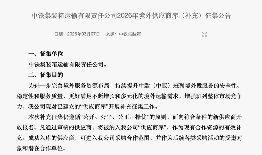 3月7日,中铁集装箱运输有限责任公司发布了2026年境外供应商库补充征集公告。