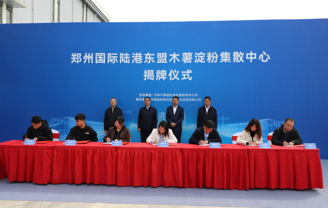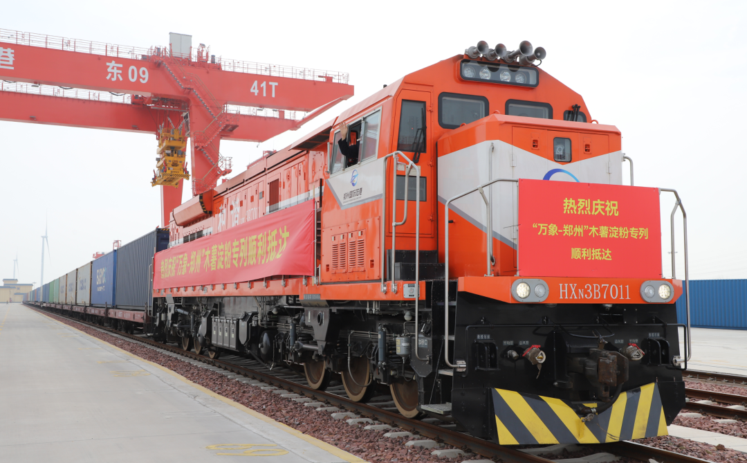 3月28日,郑州国际陆港东盟木薯淀粉集散中心在河南郑州正式揭牌。揭牌当日,一列满载950吨东盟木薯淀粉的班列驶入郑州国际陆港东作业区站台。该班列于3月23日从老挝万象站发出,经磨憨口岸入境,历时5天抵达郑州。